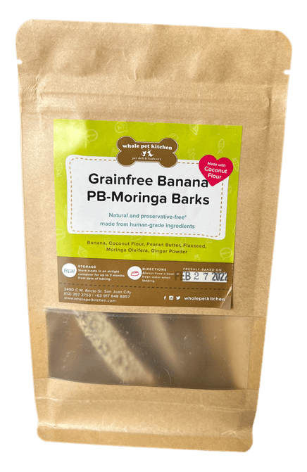 Our grainfree eggfree banana moringa PB biscotti is a fragrant and tough biscotti for doggies who are sensitive to grain and eggs. Formulated with the powerful leaves of moringa oleifera and flaxseeds, they are packed with nutrition without the grain!